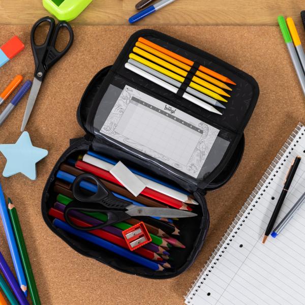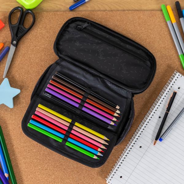 • Kompaktní penál na zip s prostornou hlavní přihrádkou a dvojitou klopou nabízí dostatek místa na psací potřeby a drobnosti.