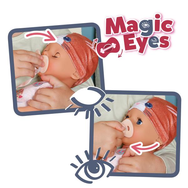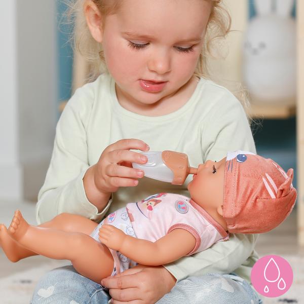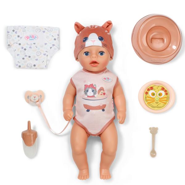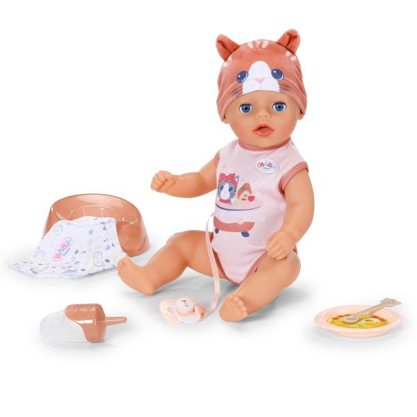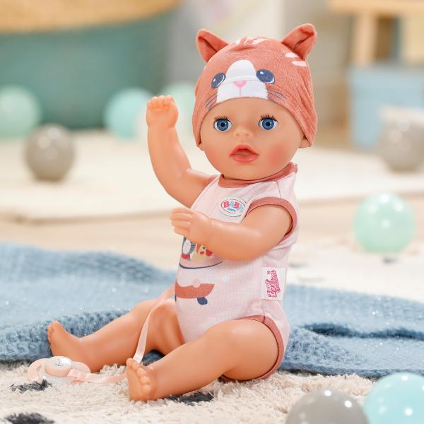 Lena v kočičím outfitu. Panenka miminko pro batolata od 1 roku se zvlášť roztomilou tváří a láskyplnými detaily oblečení. Body na patentky a čepička v kočičím designu nabádají k prvním důvěrným pečovatelským rituálům při hře s panenkou.