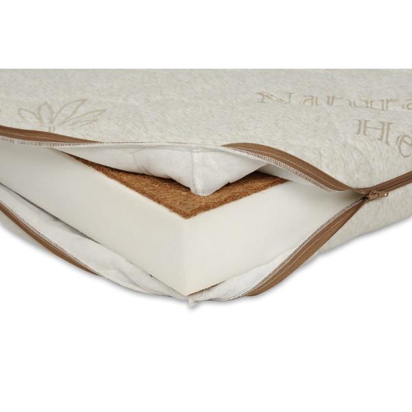 Obsahuje dva přírodní kokosové matrace spojené přírodním kaučukem a mezi nimi je mimořádně pružná a odolná polyuretanová pěna.