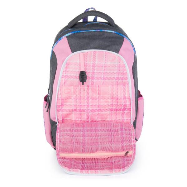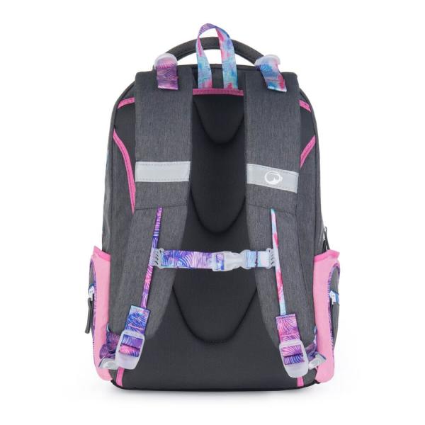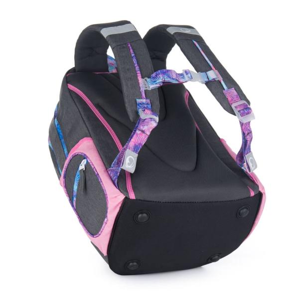 Stylový 3 komorový batoh na druhý stupeň Pevné dno s nožičkami Hlavní komora, velikost pro A4 i desky Anatomicky tvarovaná záda, měkce polstrovaná 3D síťovinou Nastavitelné ramenní popruhy, měkce polstrované + nastavitelný, univerzální hrudní pás Nový organizér v přední komoře Přezky na skateboard na přední straně batohu Poutka na zavěšení 2 postranní kapsy na láhev s malou kapsou na zip Magnetické konce popruhů Nový typ zipových taháčků – odlehčený