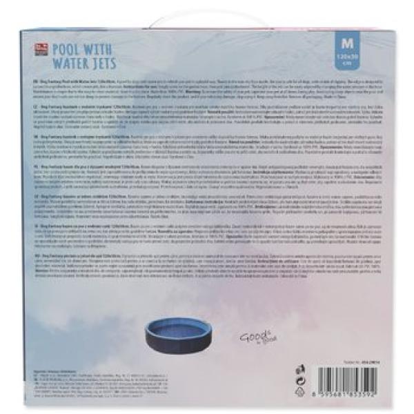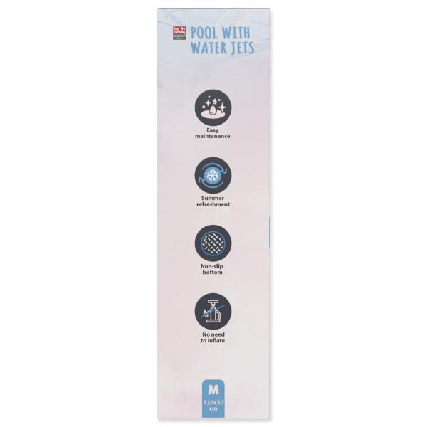 Robustní bazének s malými otvory, ze kterých stříká voda. Možnost připojení k vodní hadici pomocí přiloženého konektoru. Zábavný a bezpečný způsob, jak ochladit své mazlíčky v horkých letních dnech!Velikost: 120 x 30 cm.Návod na montáž: Roztáhněte bazének na rovné ploše, která nebude mít ostré hrany, ideálně na trávě (bez klacků a kamenů) nebo na hladké dlažbě.Při hrubé dlažbě se spárami, např. zámkové, doporučujeme podložit bazének textilií určenou pod bazény.