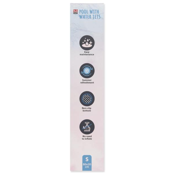 Robustní bazének s malými otvory, ze kterých stříká voda. Možnost připojení k vodní hadici pomocí přiloženého konektoru. Zábavný a bezpečný způsob, jak ochladit své mazlíčky v horkých letních dnech!Velikost: 80 x 20 cm.Návod na montáž: Roztáhněte bazének na rovné ploše, která nebude mít ostré hrany, ideálně na trávě (bez klacků a kamenů) nebo na hladké dlažbě.Při hrubé dlažbě se spárami, např. zámkové, doporučujeme podložit bazének textilií určenou pod bazény.