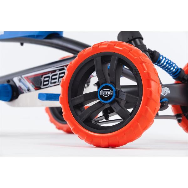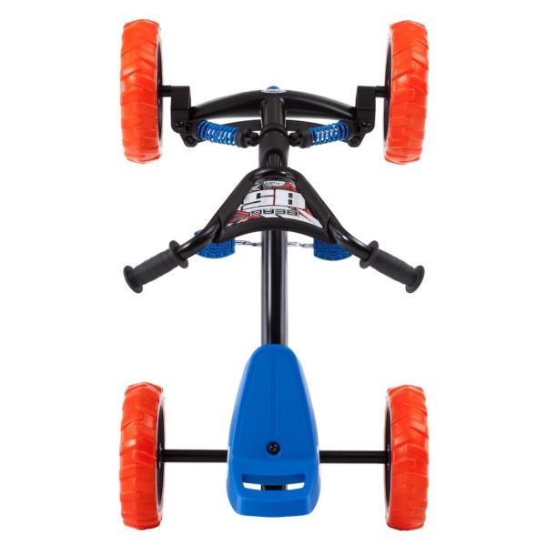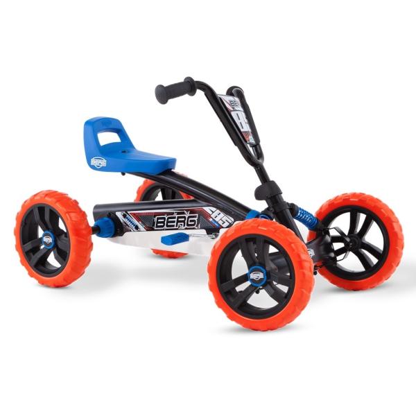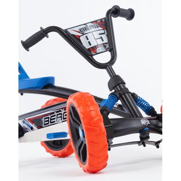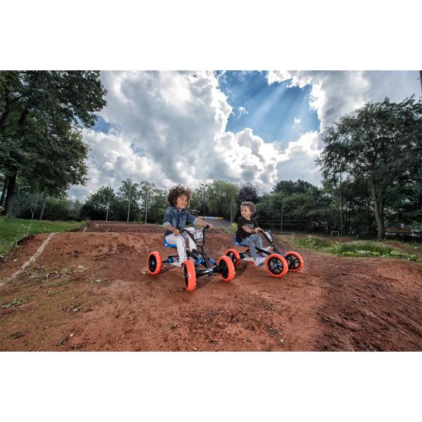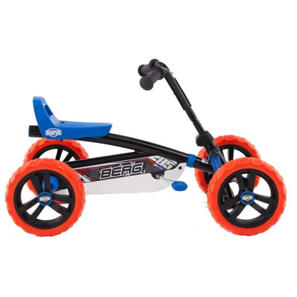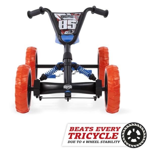 S BERG Buzzy 2-v-1 si vybíráte motokáru BERG, kterou může vaše dítě používat mnohem bezpečněji než s klasickou tříkolkou. Jelikož BERG Buzzy 2-v-1 je vybaven nastavitelnou tyčí na tlačení, delší procházky s dítětem jsou nyní bez námahy. Rukojeť se snadno připevňuje a odstraňuje a je výškově nastavitelná ve třech stupních. Z bzučivého tlačného kola můžete během chvilky udělat šlapací motokáru a naopak. Tímto způsobem spolu s pohodlnou rukojetí můžete Buzzy 2-v-1 snadno zmáčknout z A do B. Chce-li dítě jezdit samo, tyč k tlačení se dá během chvilky odstranit. S přepínatelnou volnoběžkou lze pedály posouvat, ale již nezajišťují pohon. Díky volné poloze lze bzučák jednoduše a volně tisknout pomocí tlačné tyče. Buzzy 2-v-1 lze používat ve dvou polohách díky přepínatelné volnoběžce. V poloze pedálů může dítě jezdit samostatně jako při běžném bzučení. V poloze „Push“ jsou pedály vypnuty, takže bzučák lze stlačit, aniž by se pedály otáčely. Přepínání mezi těmito dvěma stavy je snadné otáčením kroužku kolem osy pedálu doleva nebo doprava. Výhody a funkce na první pohled doporučená výška: 85 – 115 cm Maximální hmotnost uživatele: 30 kg naučte se snadno pedálovat možná jízda vpřed i vzad robustní a nepřeklápěcí čtyřkolové provedení včetně výškově nastavitelné tyče standardně přepínatelná volnoběžka standardní zámek řízení Cool off-road designové odpružení v modré barvě Výkyvná náprava pro vyrovnání nerovností v terénu Pevné pneumatiky EVA s terénním profilem, takže už nikdy nebudete mít defekt Plynule výškově nastavitelný volant a sedadlo nastavitelné ve třech polohách zaručují dlouhá léta radosti z jízdy Vhodné pro děti od 2 do 5 let