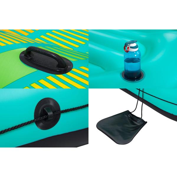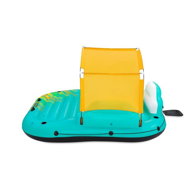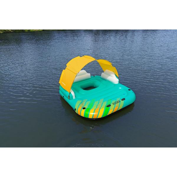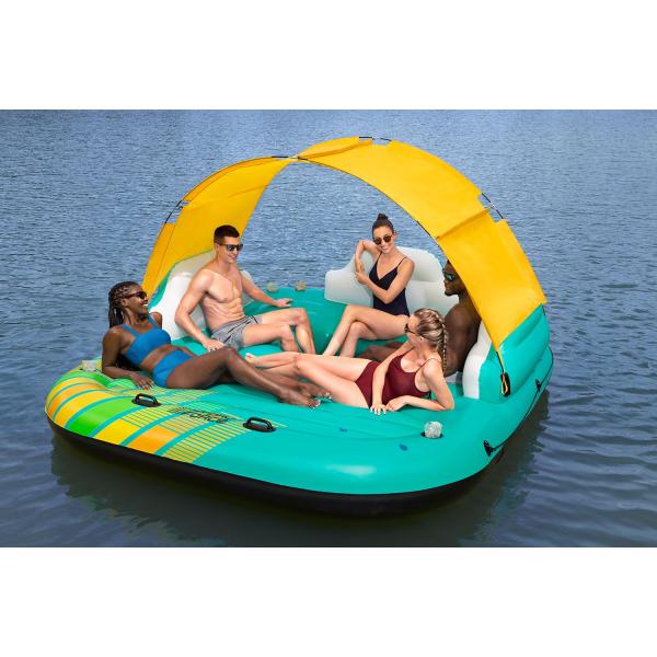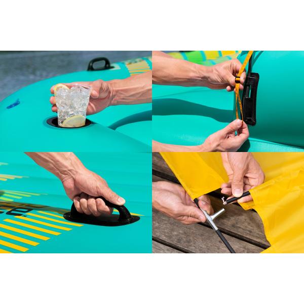 Pro maximální komfort jsou k dispozici 3 nafukovací opěrky a praktická odnímatelná sluneční stříška, která poskytuje příjemné zastínění v nejteplejších hodinách dne. Síťovaný otvor ve střední části vás zve ponořit si nohy přímo do osvěžující vody. 5 integrovaných držáků na nápoje se postará o to, aby občerstvení bylo vždy na dosah ruky. Dvě robustní rukojeti usnadňují manévrování s ostrovem a bezpečný výstup na palubu.