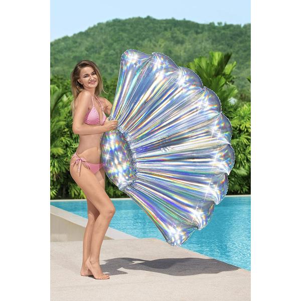 Nafukovací lehátko ve tvaru mušle. Nemusíte lovit perly, staňte se jí vy! Nafoukněte, pohodlně se usaďte a vychutnejte si letní den. Luxusní perleťová barva. Rozměr lehátka: 185 × 114 cm. Vyrobeno z kvalitního vinylu o tloušťce 0,30 mm. Maximální nosnost: 90 kg. Určeno pro 1 dospělou osobu. Sada obsahuje: 1 nafukovací lehátko, 1 opravnou záplatu.