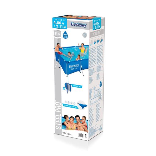 Bestway Sada obdélníkového bazénu Steel Pro™ 4.00mx 2.11mx 81cm Boční stěny z 3-vrstvého odolného PVC a polyesteru Vestavěný ventil regulace vypouštění usnadňuje vypouštění připojením ventilu k zahradní hadici Mimořádně pevné stěny tohoto bazénu jsou konstruovány z materiálu Tritech™, což je 3-vrstvý vyztužený materiál s polyesterovou mřížkou uloženou mezi dvěma vrstvami vysoce odolného PVC. Celková tloušťka stěny je 0,40 až 0,80 mm v závislosti na velikosti bazénu. Nabízí mimořádnou pevnost a odolnost.