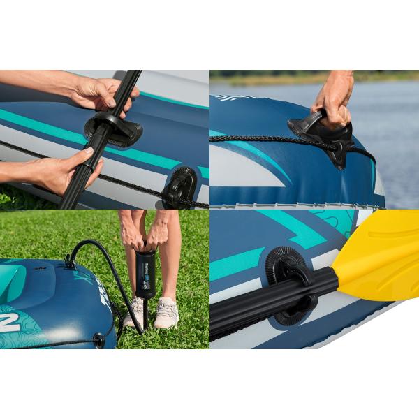 Díky širokému tvaru a 3 vzduchovým komorám poskytuje člun výbornou stabilitu pro různé vodní podmínky. Robustní nafukovací podlaha zaručuje maximální komfort během plavby. Integrované háčky na vesla se svorkami umožňují jednoduché a efektivní veslování, obvodové lano s integrovanými oky poskytuje dodatečnou bezpečnost a robustní rukojeť na přenášení usnadňuje transport. Rychloupínací ventily zajišťují rychlou a pohodlnou montáž i demontáž.