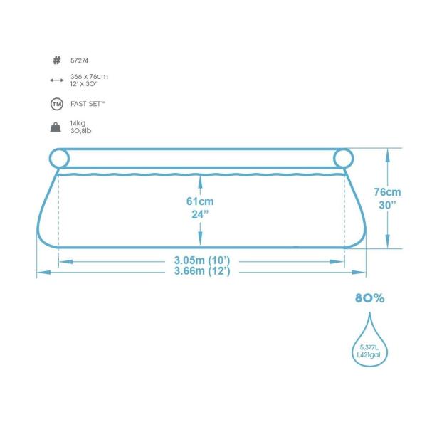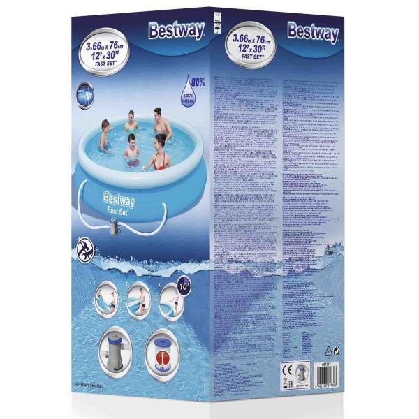Bestway Fast Set 366 x 76 cm je super rodinný bazén, se kterým si zpříjemníte i ty nejteplejší letní dny! S průměrem 3,66 metru se do něj bez problémů vleze několik lidí, aniž by si navzájem překážely Obzvlášť pro děti pak tento bazén představuje to pravé prázdninové vyžití! Díky šikovnému designu nepředstavuje jeho sestavení žádný problém – stačí bazén rozprostřít, nafouknout okrajový prstenec a naplnit jej vodou Se stoupající hladinou se vám postaví i samotný bazén, a to v průběhu 10 minut! Prostě paráda! Bazén je vyroben z trojvrstvého PVC materiálu Tritech, který je připraven odolat vnějšímu prostředí Klíčové vlastnosti: