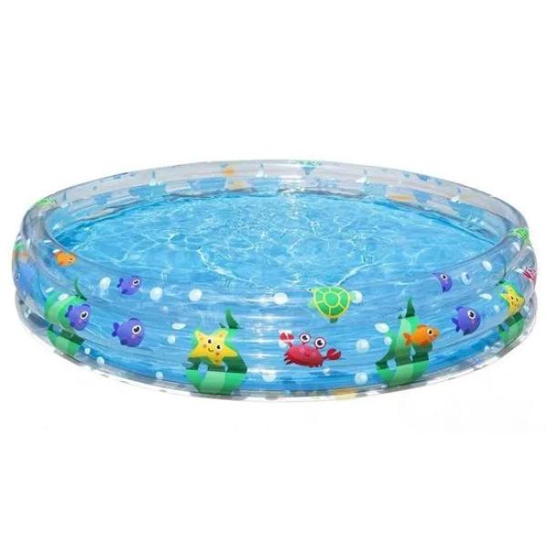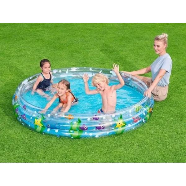Nafukovací bazén s motivem podmořský svět pro malé potápěče. Bazén má 3 kruhové, průhledné prstence s potiskem podmořského světa. Max. kapacita vody: 282 L. Rozměr: 152×30 cm. Věk: 2+ (pod dohledem dospělé osoby).