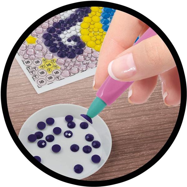 Sada GLITTERS obsahuje obrázek se samolepicí vrstvou a šablonou s písmeny a čísly, přičemž každé písmeno/číslo představuje určitou barvu a velikost krystalu. Pomocí nástroje se pak krystalky umisťují na šablonu. Výsledný obrázek se vloží do rámečku a tvoří krásnou dekoraci.