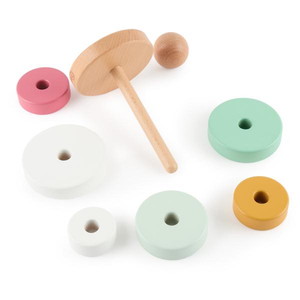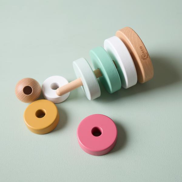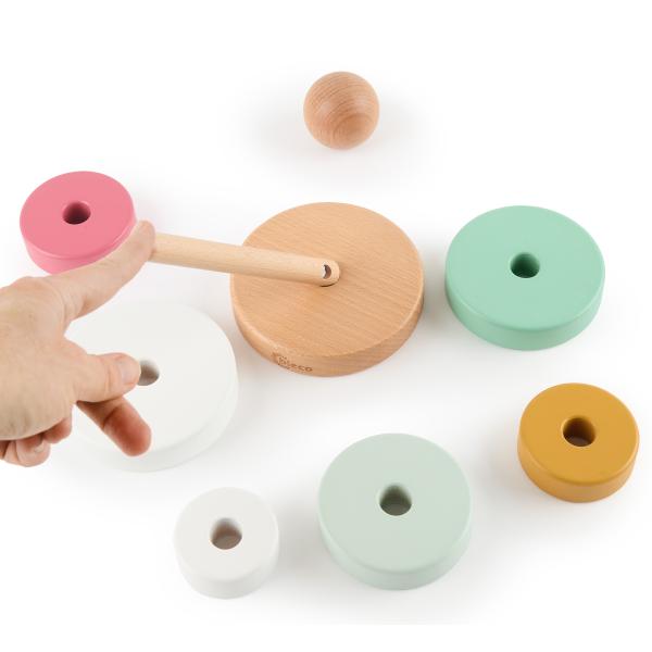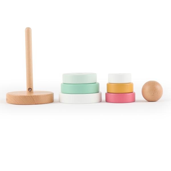 Perfektní hračka pro trénink jemné motoriky, koordinaci rukou a očí i rozpoznávání barev. Dílky jsou přizpůsobeny pro malé dětské ručičky, díky tomu si děti snadno poradí s jejich manipulací. Skládací pyramida kombinuje dětský design, jemné barvy a kvalitní dřevo a je vhodná pro děti od 12 měsíců. 6 dílků je možné třídit podle velikosti a navlékat na dřevěnou tyč. Ta je pevně spojena se základnou, lze ji však sklopit, což zajišťuje bezpečnou hru