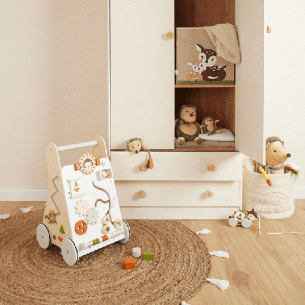 Toto stylové dětské chodítko s roztomilým designem lesních zvířat je skvělým pomocníkem při pokusech o první krůčky a zároveň zábavným herním centrem pro malé objevitele. Je vyrobeno z vysoce kvalitního dřeva a díky madlu poskytuje dětem bezpečnou oporu. Chodítko je stabilní, snadno ovladatelné a díky protiskluzovým gumovým kolečkům zajišťuje plynulý pohyb a ochranu podlahy.