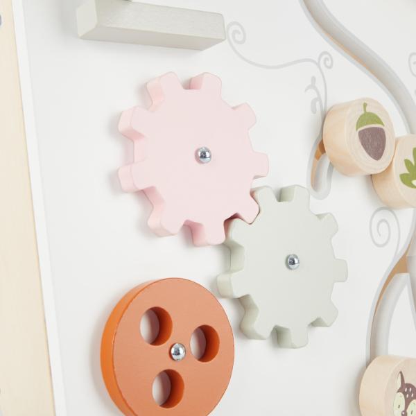 Ozubená kola nabádají k hře a zároveň trénují smysl pro tvary a pohyb.Roztomilý labyrint s lesními zvířátky a křivolaký posuvný mechanismus podporují jemné motorické schopnosti.Vkládačka s geometrickými tvary učí dítě poznávat tvary a rozvíjí jeho zručnost.Navlečené dřevěné korálky je možné libovolně posouvat a také umožňují počáteční pokusy o počítání.