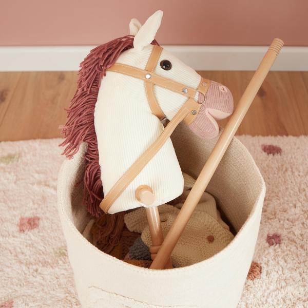 Pevná konstrukce a praktické boční rukojeti zajišťují bezpečné uchopení, zatímco hladká kolečka nezanechávají stopy na podlaze a kloužou po hladkém rovném povrchu. Tyč se dá snadno rozdělit na dvě části pro pohodlné skladování nebo cestování. Koník Ginger bude věrným parťákem dětí na všech cestách – ať už jde o tichou jízdu pohádkovým lesem nebo divoké závody plné smíchu.