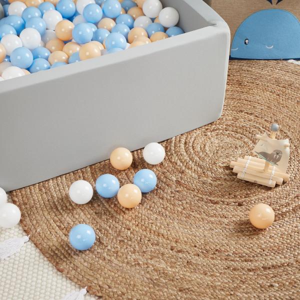 Objevte kouzlo barevných hracích míčků. Sada 100 ks hracích míčků v krásných barvách bílé, béžové a nebesky modré – jako den na pláži. Ideální zábava na zahradu, do hracího koutku nebo do vany či bazénu. Míčky využijete na hraní doma i venku. Perfektní doplněk pro dětskou radost a rozvoj jemné motoriky!