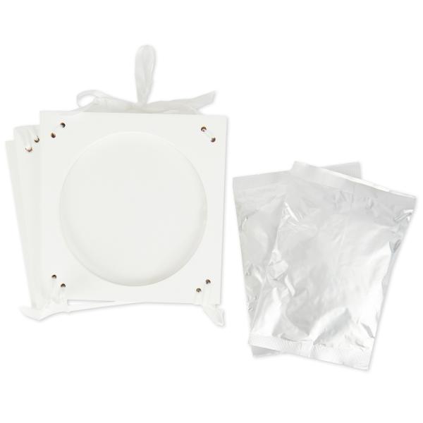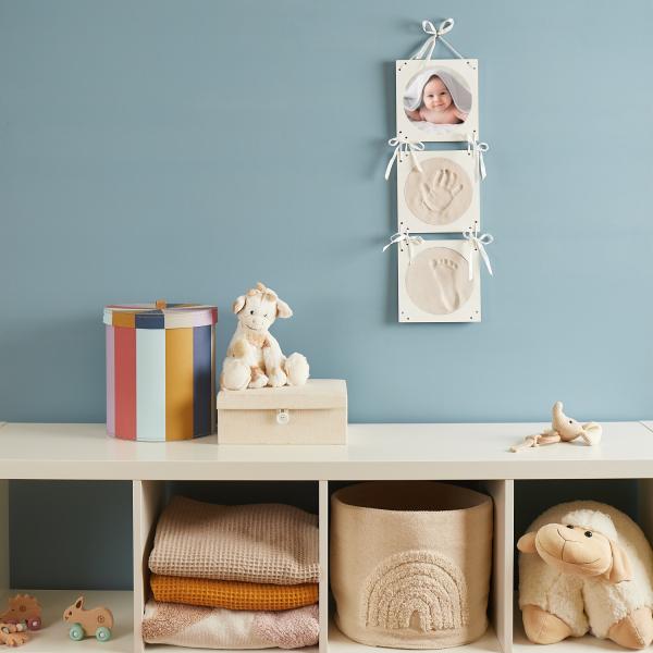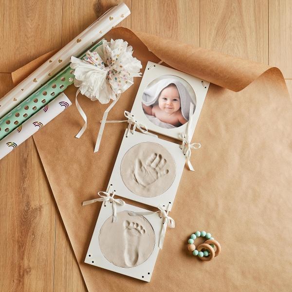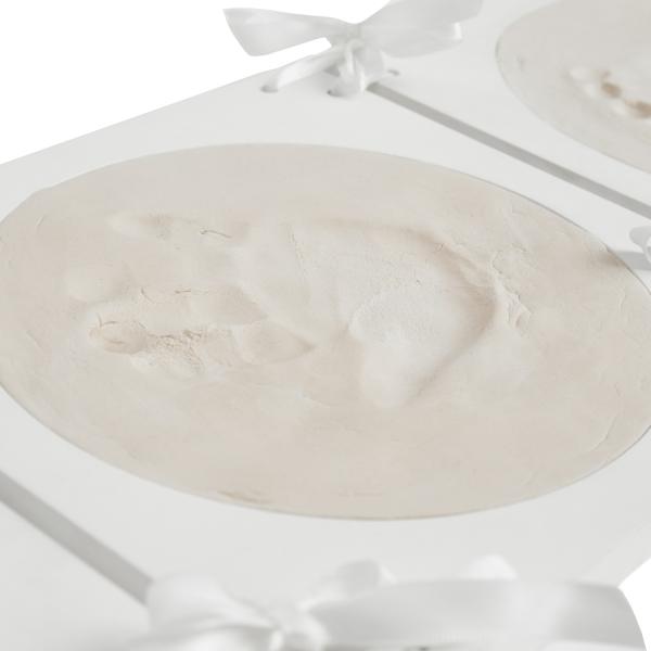 Zachyťte kouzelné okamžiky s touto vzpomínkovou sadou pro otisky dětských ručiček a nožiček. Elegantní sada kulatých rámečků se třemi okénky nabízí prostor pro dva otisky a jednu fotografii vašeho miminka. Množství modelovací hmoty je optimální pro všechny varianty otisků – pouze nožičky, ručičky, nebo jejich kombinaci. Jednotlivé prvky rámu spojuje jemná stužka, která dodává dekoraci jedinečný vzhled. Výjimečný dárek k narození miminka, který uchová krásné vzpomínky na celý život.