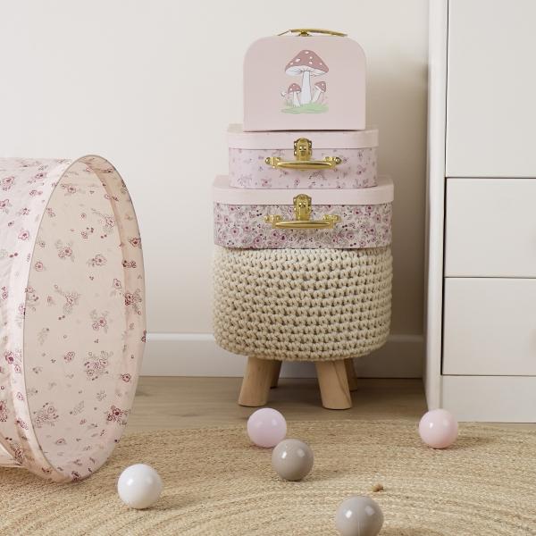 Sada tří kartonových kufříků je skvělým doplňkem do dětského pokoje i praktickým společníkem na cesty. S nádhernými květinovými vzory a motivem kolouška Elly okouzlí všechny malé dobrodruhy. Pevné kartonové kufříky mají odolnou kovovou sponu a pohodlnou rukojeť. Jsou ideální na ukládání dětských pokladů a hraček. Díky možnosti vkládat kufříky do sebe jsou skladné i multifunkční. Děti i jejich rodiče si je zamilují nejen pro jejich krásu, ale i užitečnost.