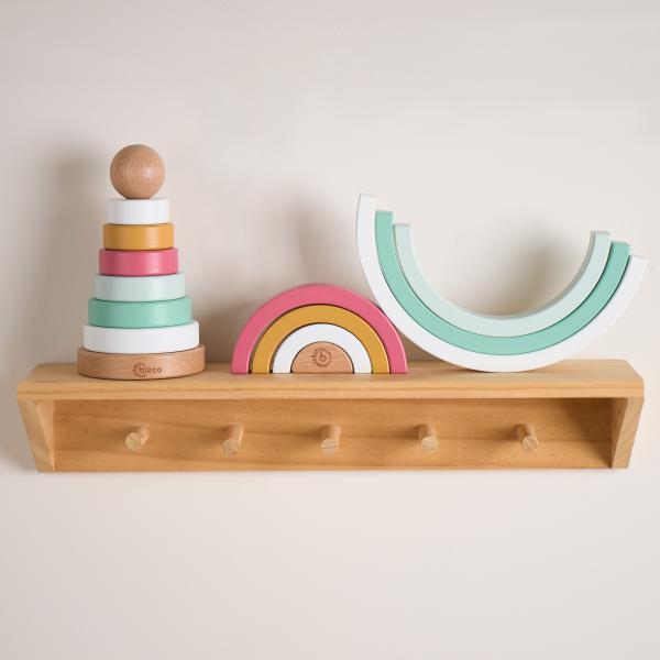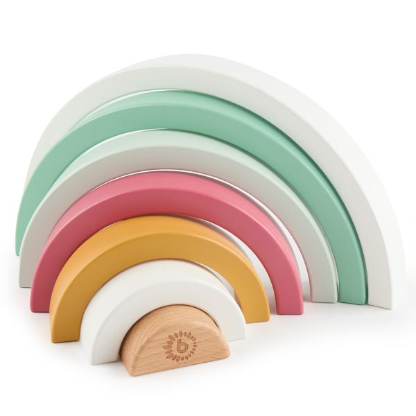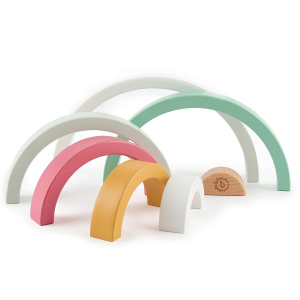 Perfektní hračka pro trénink jemné motoriky, koordinaci rukou a očí i rozpoznávání barev. Dílky jsou přizpůsobeny pro malé dětské ručičky, díky tomu si děti snadno poradí s jejich manipulací. 7 snadno uchopitelných dřevěných oblouků může vaše dítě skládat, třídit nebo se s nimi samostatně hrát. Jednoduché tvary nabádají děti k nápadité hře, která podporuje dětskou fantazii a kreativitu. Jak děti rostou, používají duhu jako kolébku pro panenky, jako plot pro zvířátka, jako tunel nebo most pro vozidla, jako domeček pro plyšové hračky a panenky. Tyto dílky barevné duhy mohou děti vždy integrovat do hry s množstvím fantazie.