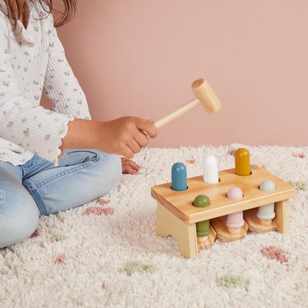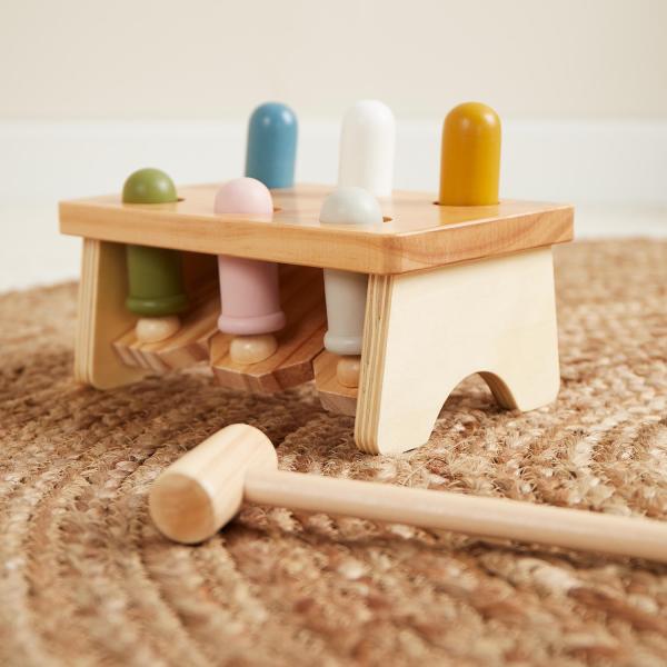 S touto zatloukací hračkou ve tvaru lavičky se děti zaručeně nudit nebudou! Když vaše dítě bouchá kladivem na barevné dřevěné válce, pohybují se vtipně nahoru a dolů.