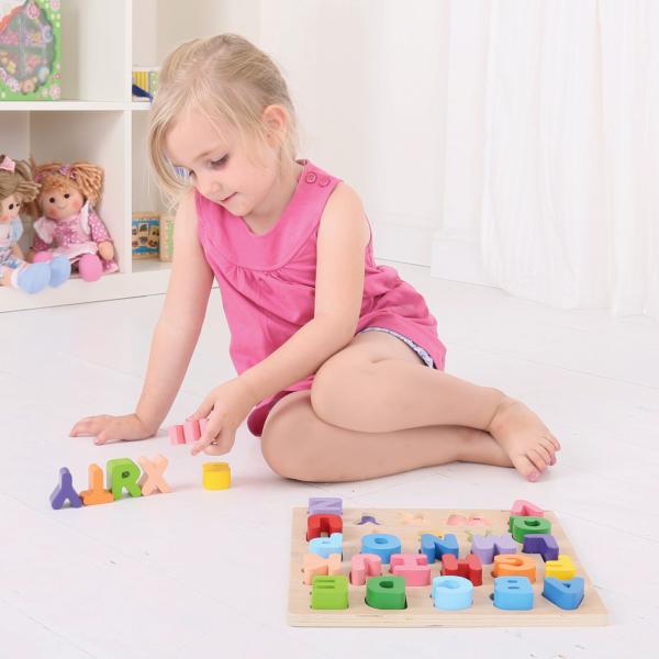 Pomocí této dřevěné pestrobarevné abecedy bude pro děti učení písmenek hračka. Každé písmenko je barevně sladěno se svým základním otvorem, což pomáhá rozvíjet schopnost vzpomínání a rozpoznávání. Dílky jsou robustní, akorát pro malou dětskou ručku. Pro toto vkládací puzzle je charakteristická šířka použitého materiálu, tím i bezpečnost hračky. Pro děti snadno uchopitelné. Hlavní vlastnosti: součástí balení je vše podle obrázku obsahuje 26 dílků vyrobených z vysoce kvalitních materiálů vyhovuje současným evropským bezpečnostním normám