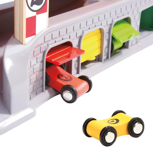 Autodráha s garážemi obsahuje čtyři barevná dřevěná autíčka, která se mohou protáčet a tak snadno zdolávají kaskádu barevných cestiček. Zábavná hračka nejen pro kluky, kterou si děti zamilují.