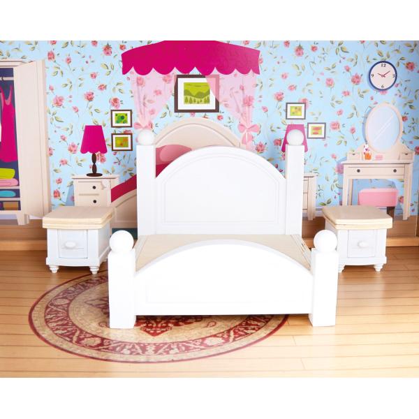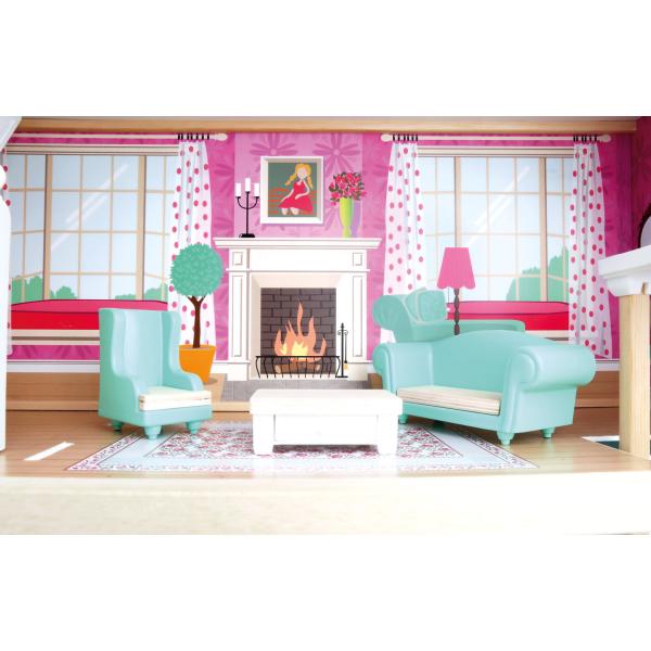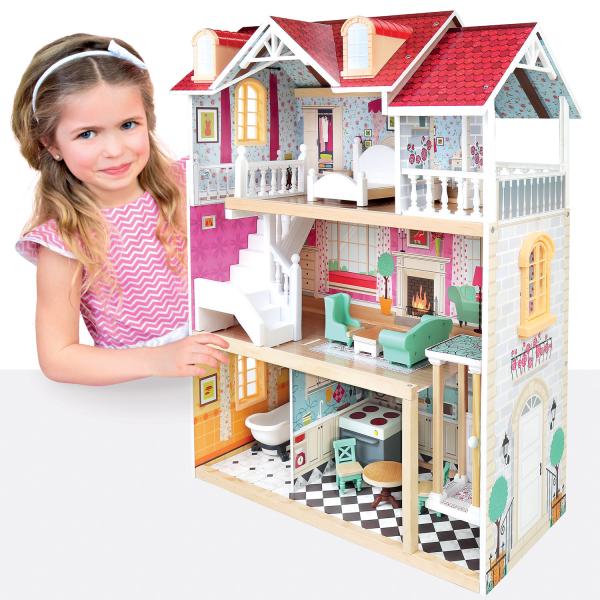 Dřevěný domeček pro panenky. Třípatrový, barevný robustní a odolný domeček s 13 ks příslušenství. S plně vybavenými pokoji jako je kuchyň, obývací pokoj, koupelna a ložnice, včetně podlahového schodiště, balkonu a výtahu. Obsáhlé vybavení podporuje nové herní nápady, hraní rolí a vytváření představy, jak vést vlastní domácnost. Do hry na velkou rodinu lze zapojit sourozence nebo kamarády a naučit se tak vše sdílet společně. Sociální dovednosti se tak rozvíjejí už iu těch nejmenších. Fantazii se zde meze nekladou! Vhodné pro děti od 36 měsíců. Upozornění: Použití dětmi do 3 let pouze pod dohledem dospělé osoby. Výška podlaží cca 20 cm. Rozměry produktu: cca 77x27x62 cm.