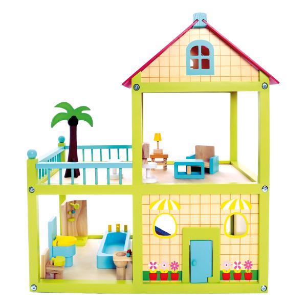 Snad každá holčička touží po kouzelném domečku pro své panenky. Nyní je může ubytovat v nádherném domečku s terasou, odkud mohou sledovat okolí nebo se opalovat v pohodlném lehátku. Velký dřevěný domek v pestrých veselých barvách má dvě patra a je vybaven nábytkem. Jeho obyvatelky mohou sledovat televizi, umýt se v koupelně a po náročném dni nabrat síly v pohodlné posteli. V domečku bude milovaným panenkám jako v ráji a vaše holčička si s ním úžasně vyhraje. Do domečku se mohou nastěhovat panenky do výšky 11 cm. Hračka je vhodná pro děti od 3 let. Velký dřevěný domeček pro panenky Pestré barvy zaujmou každé dítě Domek se pyšní pěknou terasou Doplňky v podobě nábytku jsou součástí balení Barvy jsou zdravotně nezávadné Podporuje dětskou představivost Vhodný pro děti od 3 let Rozměry: 55,5 × 30,2 × 50 cm