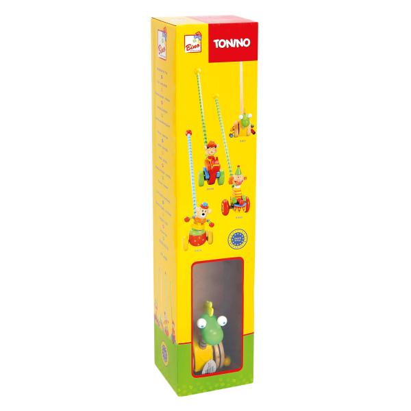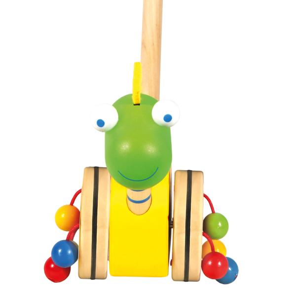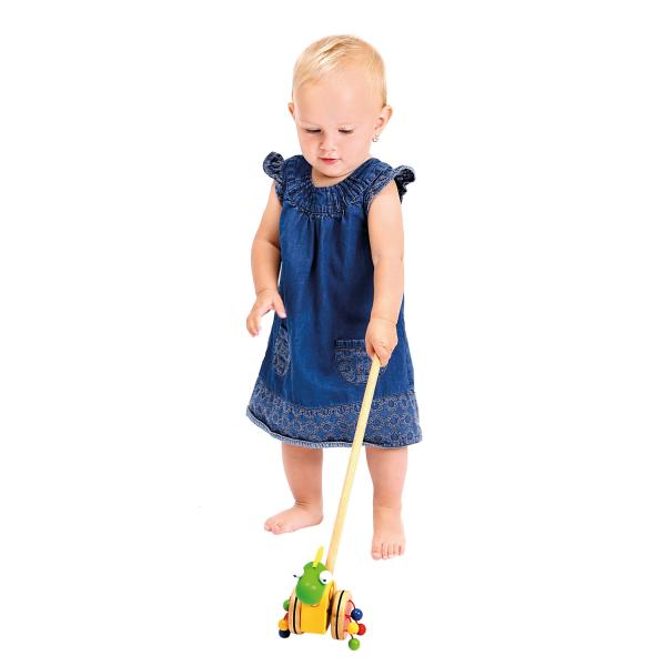 Dřevěný dinosaurus na tyči s barevnými korálky na kolečkách, při jízdě vydává zvuky. Rozměry: 7x7x55 cm.