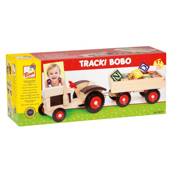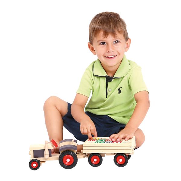 Traktor a přívěs ABC jsou vyrobeny ze dřeva a jsou navrženy tak, aby byly velmi pohyblivé. V přívěsu je 15 kostek s různými motivy, čísly a písmeny. Skvělý traktor pro děti, které milují vozidla, který navíc obsahuje vzdělávací prvek. Děti mohou prsty sledovat písmena, čísla a motivy na kostkách a lépe si tak pohyby zapamatovat. To následně pomůže dítěti, když se učí ve škole číst a psát, protože už čísla a písmenka důvěrně zná. Velikost 40x11x8,5 cm Pro děti od 36 měsíců.