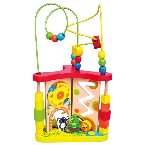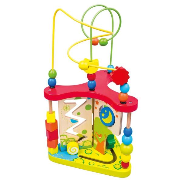 Víceúrovňový dřevěný labyrint s korálky zaujme děti pestrými barvami a množstvím herních prvků. Na hračce se nacházejí korálky různých tvarů a velikostí, které se dají posouvat po kovových dráhách, jakož i figurky zvířátek, které lze přemisťovat. Kromě zábavy děti při hře rozvíjejí jemnou motoriku, koordinaci rukou a očí a učí se orientovat v prostoru. Aktivní prvky navíc podporují rozpoznávání čísel, barev a denní doby, čímž stimulují jejich poznávací schopnosti.
