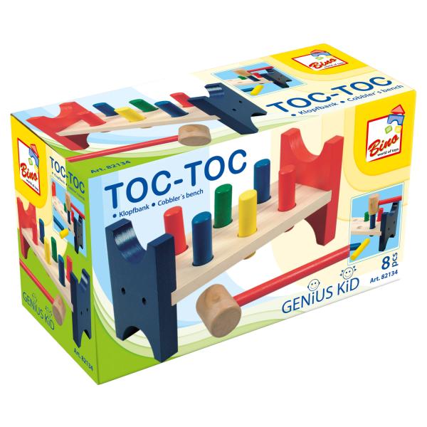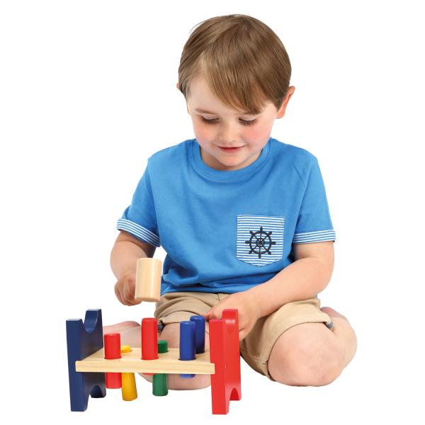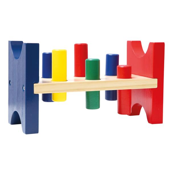 Barevná zatloukačka s kladivem pro skutečné řemeslníky, s praktickým efektem přetáčení. Kolíky s lakem odolným vůči slinám musí být zatlučeny do otvorů pomocí kladiva. Stabilní a robustní dřevěná hračka zabalená do čtyřbarevné krabičky. Pro děti od 18 měsíců. Upozornění: Aby se předešlo možným drobným zraněním, doporučuje se účast dospělých. Velikost je přibližně 22x12x9 cm.