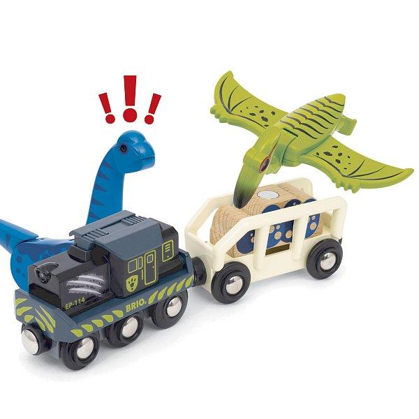 Vydejte se na prehistorické dobrodružství s Dinosauřím vláčkem na baterie. Z paluby vláčku na baterie s funkcí jízdy vpřed, vzad a předním světlem prozkoumejte svět dinosaurů. Ve vagónku vláčku přepravíte dinosaury a jejich vejce z místa na místo po kolejích. Nechybí dva hraví barevní dinosauři, jedinečné pohyblivé součásti a klasické magnety BRIO pro interakci s okolním světem. Rozměry balení: 5x25x15cm. Věk: 3+
