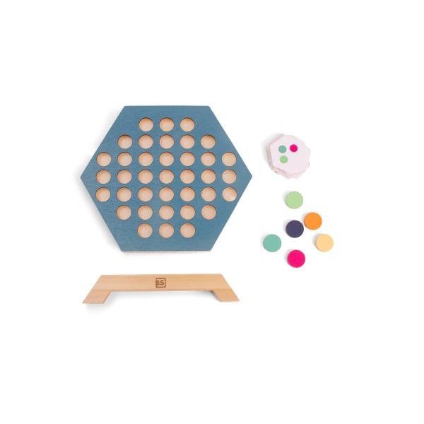Hrací zvrat v klasické hře čtyři v řadě! Po zamíchání karet vzorů lícem dolů si každý hráč vybere kartu a položí ji na stůl lícem nahoru, připraven na akci. Střídejte se a strategicky umisťujte své vícebarevné dřevěné žetony do slotů šestiúhelníkového dřevěného podstavce tak, aby odpovídaly vzoru na vaší kartě. Vítězem se stává hráč, který úspěšně znovu vytvoří vzor své karty. Pokud chcete přidat na výzvě, karty nemají horní ani spodní část, takže se podívejte na karty ze všech stran, abyste viděli, jak bude vzor vypadat z různých směrů. Ale tady je zvrat: karty zůstávají viditelné pro oba hráče, protože tato hra není jen o vytváření vašeho vzoru – je to o zastavení druhého hráče v dosažení jejich.