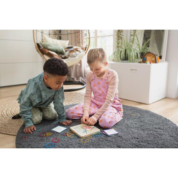 Didaktická hračka pro děti od 4 let, se kterou si zahrají jak chlapci, tak dívky. Děti pomocí různě dlouhých barevných gumových pásek a kolíčků skládají geometrické tvary a obrázky podle šablon. Nebo se nechte unést svou fantazií a vymyslete si vlastní vzory. Hračka je vhodná jak pro předškoláky, tak pro školní děti.