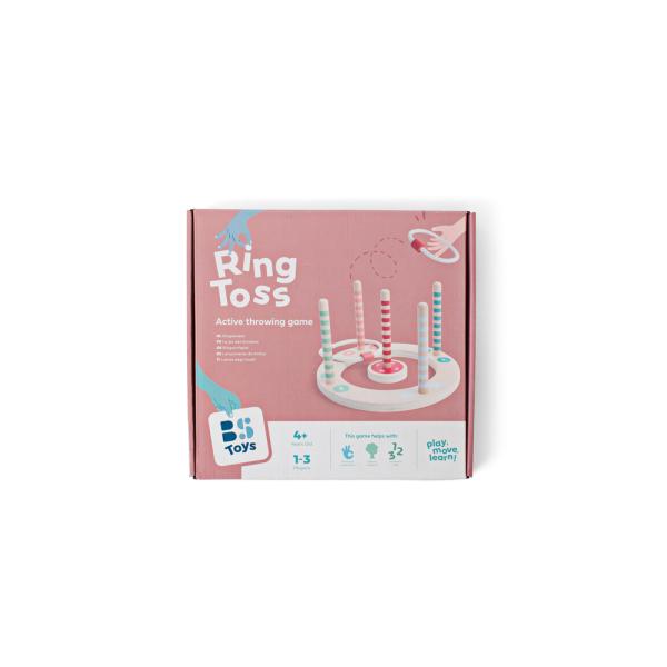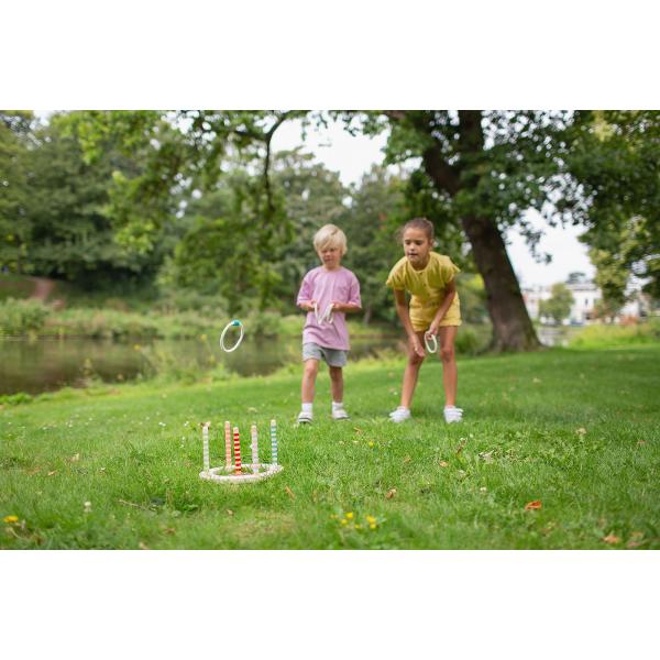 Zábavná motorická hra pro všechny věkové kategorie je vhodná pro domácí i venkovní využití. Cílem hry je házet kruhy na stojan a získat co nejvíce bodů. Vyšší počet bodů získáte, pokud se vám podaří hodit kruh na střední hrot. Obtížnost hry můžete zvyšovat vzdáleností hráčů od stojanu. Nejmenší děti tedy budou házet z kratší vzdálenosti. Ideální aktivita na zahradě při pěkném počasí nebo při dešti doma. Házet kroužky rozvíjí motoriku a obratnost a navíc se děti při bodování učí počítat. Posláním této hry je umožnit dětem bavit se bez chytrých telefonů a tabletů.