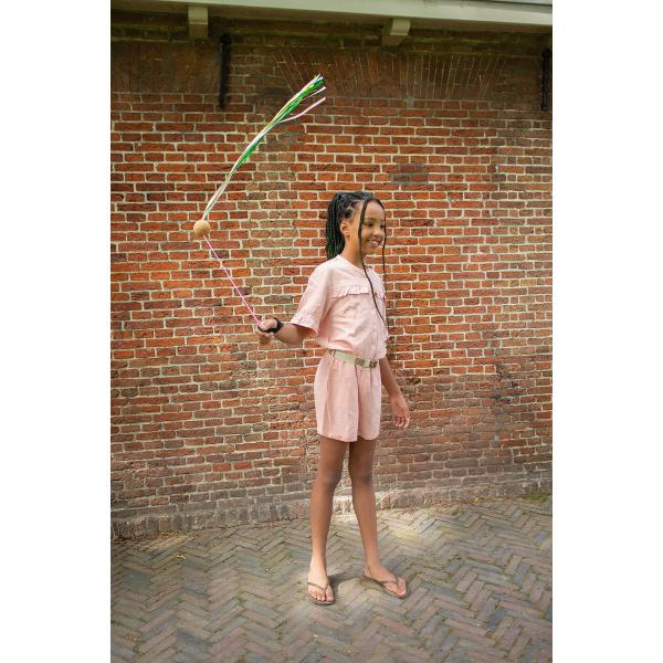 8 látkových stuh 140 cm, rukojeť 21,5 cm, lano 41 cm, korková koule průměr 6 cm.