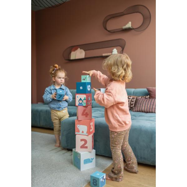Úkolem dítěte je sestavit pyramidu z kostek tak, aby vznikla logická posloupnost složená z obrázků zvířat a čísel. Kromě toho může dítě kostky skládat i vodorovně, jednu vedle druhé. Určeno pro děti od 18 měsíců.