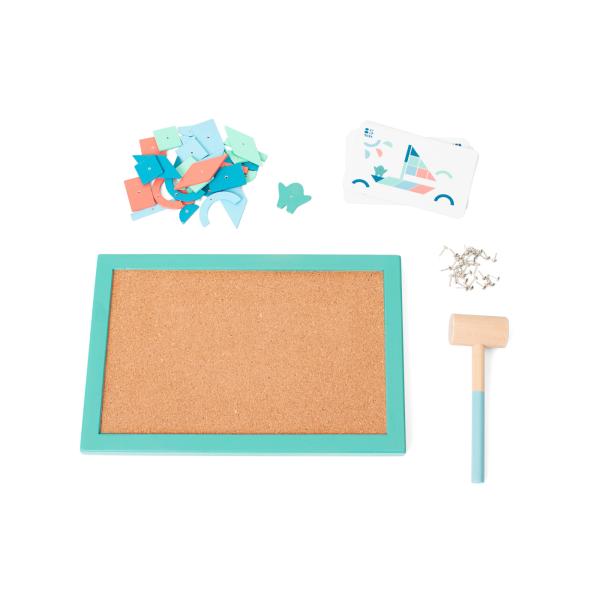 Sada obsahuje: korkovou nástěnku (19 x 29 cm), 10 karet se vzorem (8 x 13 cm), 33 zatloukacích tvarů, 1 kladívko.
