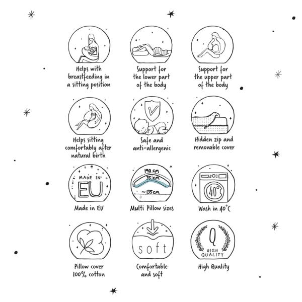 Důležité: Před každým použitím vždy zkontrolujte stav polštáře, abyste zajistili maximální bezpečnost a pohodlí pro vás a vaše dítě.