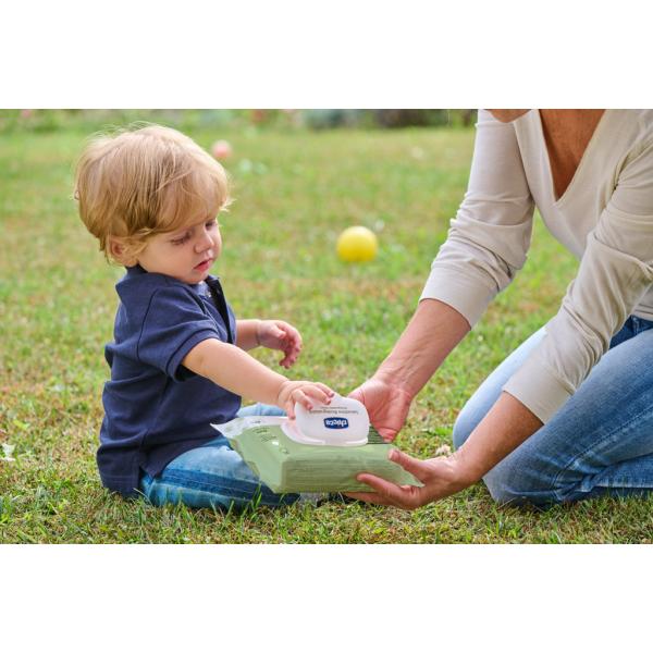 Vlhčené ubrousky Chicco jsou vyrobené z 100 % biologicky odbouratelných přírodních vláken a jsou ideální při výměně plenek i k čištění rukou a obličeje dítěte.
