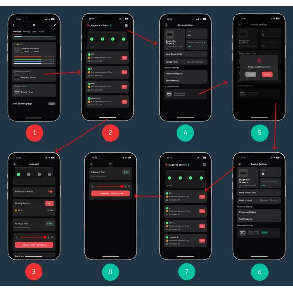 Zařízení však mohou používat i majitelé dávkovacích zařízení jiných značek. V tomto případě se však Chihiros Magnetic Stirrers nespojí přímo s dávkovacím zařízením, ale je nutné nastavit čas manuálně. Celý postup nastavení je znázorněn na obrázku výše. (č. 1 -> 2 -> 3)