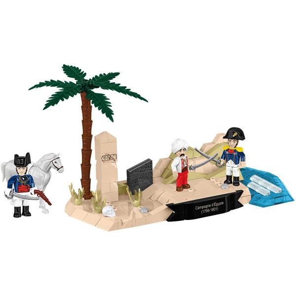 Sada obsahuje detailně zpracovaný vstup do chrámu s typickými egyptskými reliéfy, který slouží jako dechberoucí kulisa pro akční scény. Součástí balení jsou tři figurky: samotný Napoleon Bonaparte na svém bílém koni, francouzský voják v dobové uniformě a místní průvodce. Celý set je doplněn o funkční prvky a autentické doplňky, jako jsou zbraně, vlajky a palmy. Všechny grafické detaily jsou na kostky naneseny pomocí vysokokvalitní tisku, který je odolný vůči oděru i slunečnímu záření, takže model si zachová svůj prémiový vzhled i po letech hraní.
