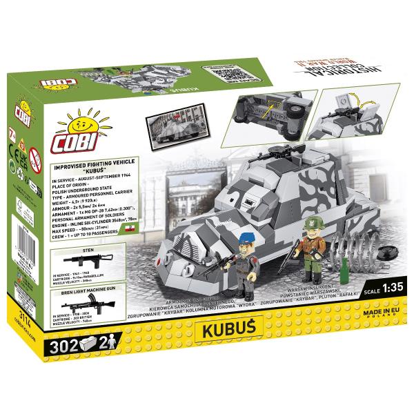 Postavte si model Kubuś, polský improvizovaný obrněný automobil, který postavili varšavští povstalci v srpnu 1944 během Varšavského povstání. Toto vozidlo bylo postaveno během několika dní v dílně na ul. Tamka. Byl postaven pomocí podvozku nákladního vozidla Chevrolet 157 a ocelových plechů, které měly posádku chránit před nepřátelskou palbou. Kubuś, vyzbrojený kulomety, se zúčastnil několika bojových operací, včetně neúspěšného útoku na Varšavskou univerzitu. Po skončení povstání Kubuś jako zázrakem přežil válku a v současnosti je vystaven v Polském armádním muzeu ve Varšavě jako symbol odvahy a vynalézavosti varšavských povstalců! Balení obsahuje 302 kostek a 2 figurky.