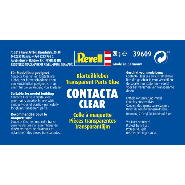 Revell Contacta Clear je speciální průzračné lepidlo ideální pro stavění modelů. Jedná se o lepidlo na vodní bázi, které se hodí na různé druhy plastů. I po zaschnutí zůstává velmi čiré a průhledné, takže Může být využito zejména pro lepení průhledných částí modelů, jako jsou okna a kryty pilotních kabin. Pomocí štětce ukrytého ve víčku lahvičky lze jednoduše nanese tenká vrstvu na obě strany určené k přilepení. Návod k použití: Naneste tenkou vrstvu lepidla Contacta Clear na oba lepené dílky. Nechte vyschnout na vzduchu cca 5-10 minut, přičemž lepidlo musí být stále lepkavé. Poté spojte oba dílky příslušnými stranami k sobě a chvíli držte pomocí rukou. Obsahuje Směs látek 5-chlor-2methylisothiazol-3 (2H) on a 2-methylizothiazol3 (2H) -on s chloridem hořečnatým a Dusičnan hořečnatý. Může vyvolat alergickou reakci. Chraňte před mrazem! Pozor! Tento výrobek není hračka.