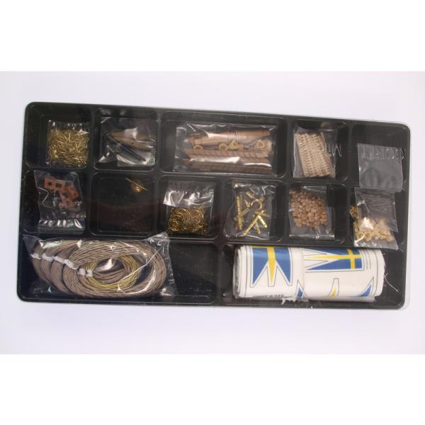 Po otevření víka krabice naleznete dřevěné díly modelu z překližky, sadu lišt, drobné součásti uzavřené v plastovém průhledném blistru, sadu výkresů a manuál.