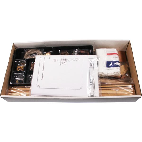 Po otevření víka krabice naleznete dřevěné díly modelu z překližky, sadu lišt, drobné součásti uzavřené v plastovém průhledném blistru, sadu výkresů a manuál.