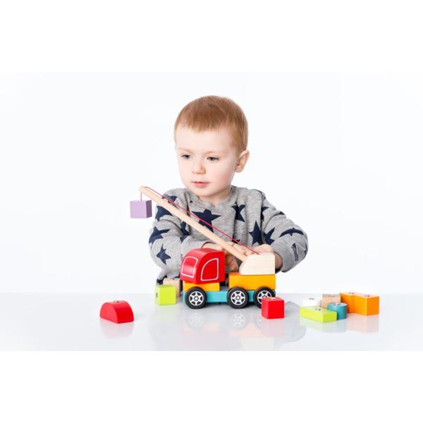 Autojeřáb s magnetem je dřevěná skládačka s 14 barevnými díly. 10 samostatných kostek představujících náklad má v sobě zabudované kovové plíšky, díky kterým je magnet na jeřábu může zvednout a přemísťovat. Sortiment hraček značky Cubik…