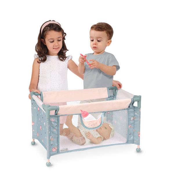 DeCuevas 50080 Cestovná postýlka pre panenky COCO 2024, ze stejnojmenné kolekce, která je novinkou roku 2024, je nejen krásným doplňkem dívčího pokoje, ale také skladnou a lehce přenosnou postýlkou na cesty. Kolekce nabízí nejen kočárky, ale také další doplňky nejen pro malé slečny a jejich panenky, ale také pro chlapce. V hravé kolekci COCO dominuje obrázek dinosaura maminky se svým roztomilým mládětem, které nese na zádech ještě vaječnou skořápku. Potisk malého dinosaura na jemně holubě šedomodré látky je základem celé kolekce, kterou zdobí prvky v pískové nebo růžovkasté barvě, která se promítá i do většiny nosných konstrukcí. Nádherný španělský design, precizní zpracování. Velmi jednoduchá manipulace během samotné hry. Materiál: kov, plast, textil. Baleno v krabici v barvách kolekce. Doporučený věk od 3 let.
