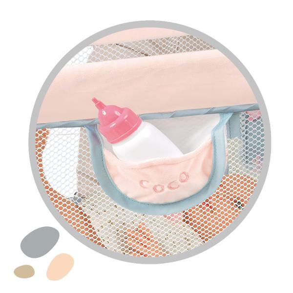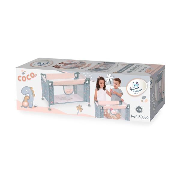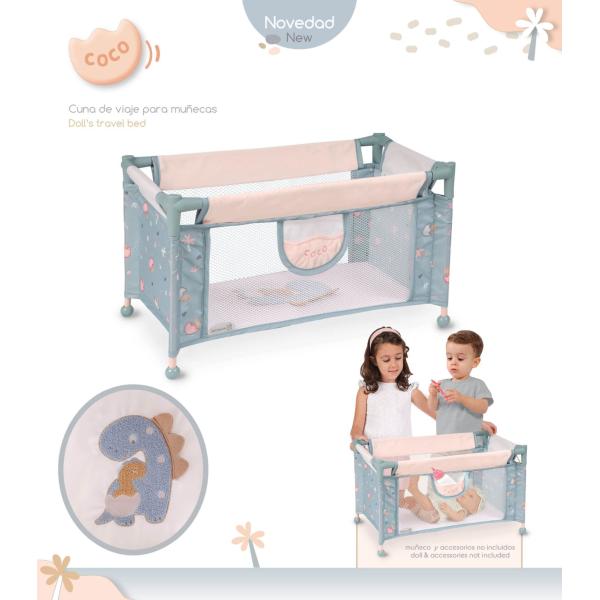 DeCuevas 50080 Cestovná postýlka pre panenky COCO 2024 patří do stejnojmenné kolekce, která je novinkou roku 2024 a nabízí nejen kočárky, ale také další doplňky nejen pro malé slečny a jejich panenky, ale také pro chlapce. V hravé kolekci COCO dominuje obrázek dinosaura maminky se svým roztomilým mládětem, které nese na zádech ještě vaječnou skořápku. Potisk malého dinosaura na jemně holubě šedomodré látky je základem celé kolekce, kterou zdobí prvky v pískové nebo růžovkasté barvě, která se promítá i do většiny nosných konstrukcí.