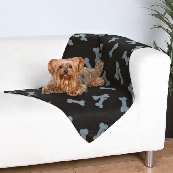 Deka pro psy. Chrání interiér před nečistotami a chlupy. Z kvalitního fleecu Barva černá Velikost 100 x 70cm Se vzorem kůstek Lze prát v pračce